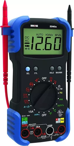El multímetro de rango automático Innova 3340 cuenta con una sonda de temperatura para recuperar y mostrar temperaturas tanto en Celsius como en Fahrenheit, lecturas de RPM del vehículo (incluidos vehículos con bobina en bujía) con captación inductiva incluida, ajustes automáticos a cero y protección contra polaridad inversa. El 3340 es excelente para probar diodos de alternador, ciclo de trabajo, solenoides, puntos de interrupción, cableado, interruptores y más.