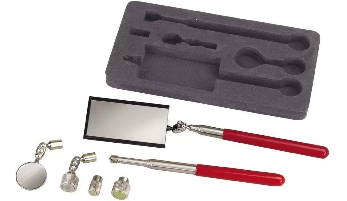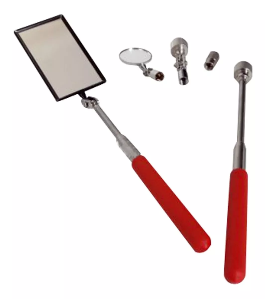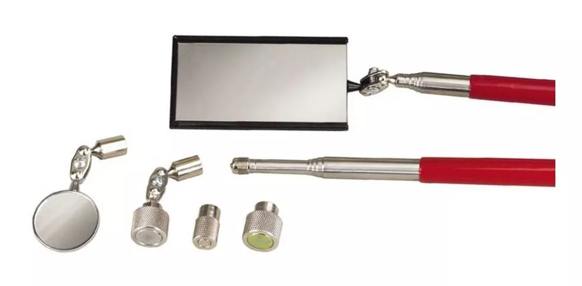 Maneja telescopio de 6-1/2″ a 25″. Los cabezales giratorios permiten el acceso a áreas estrechas. El espejo giratorio grande y rectangular es de 2 «x 3-1/2», y está unido a un mango telescópico. El espejo pequeño tiene un diámetro de 1-1/4 «y es intercambiable con imanes en el otro mango. Los imanes pueden levantar hasta 3.6 KG